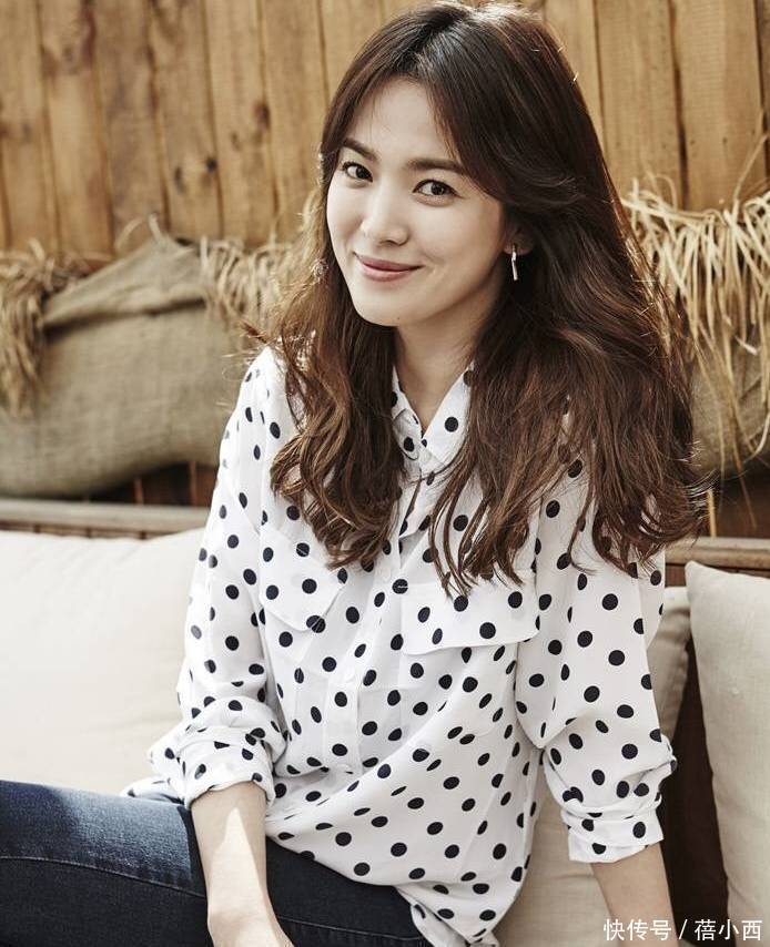 宋慧乔这件等于最基础的波点衬衫,白底黑波点,翻领有口袋,搭配牛仔裤最恰当,无为制造斯文感。